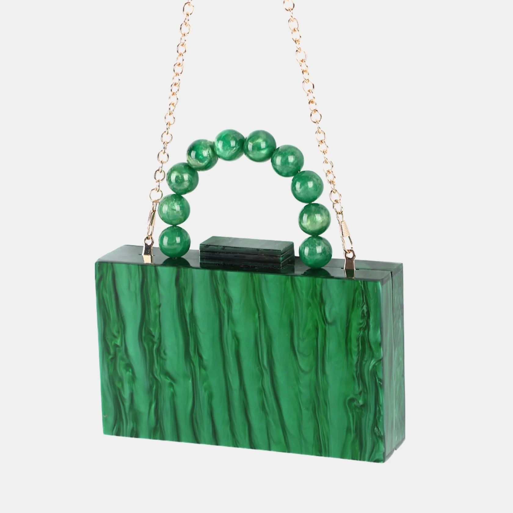 Featuring a sleek marbled acrylic body and a rounded beaded handle, this bag blends playful charm with modern sophistication. Perfect for evenings out or as a standout accessory to elevate any look.