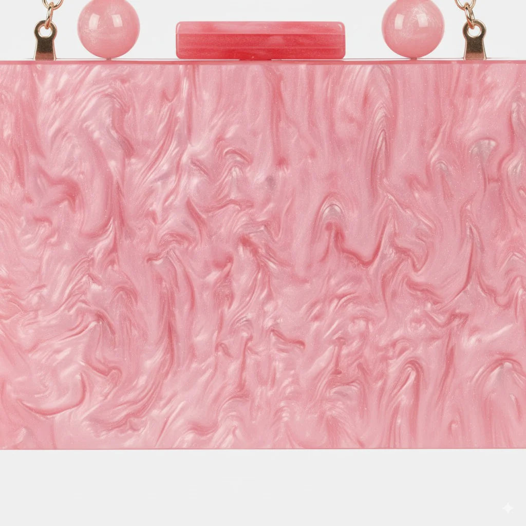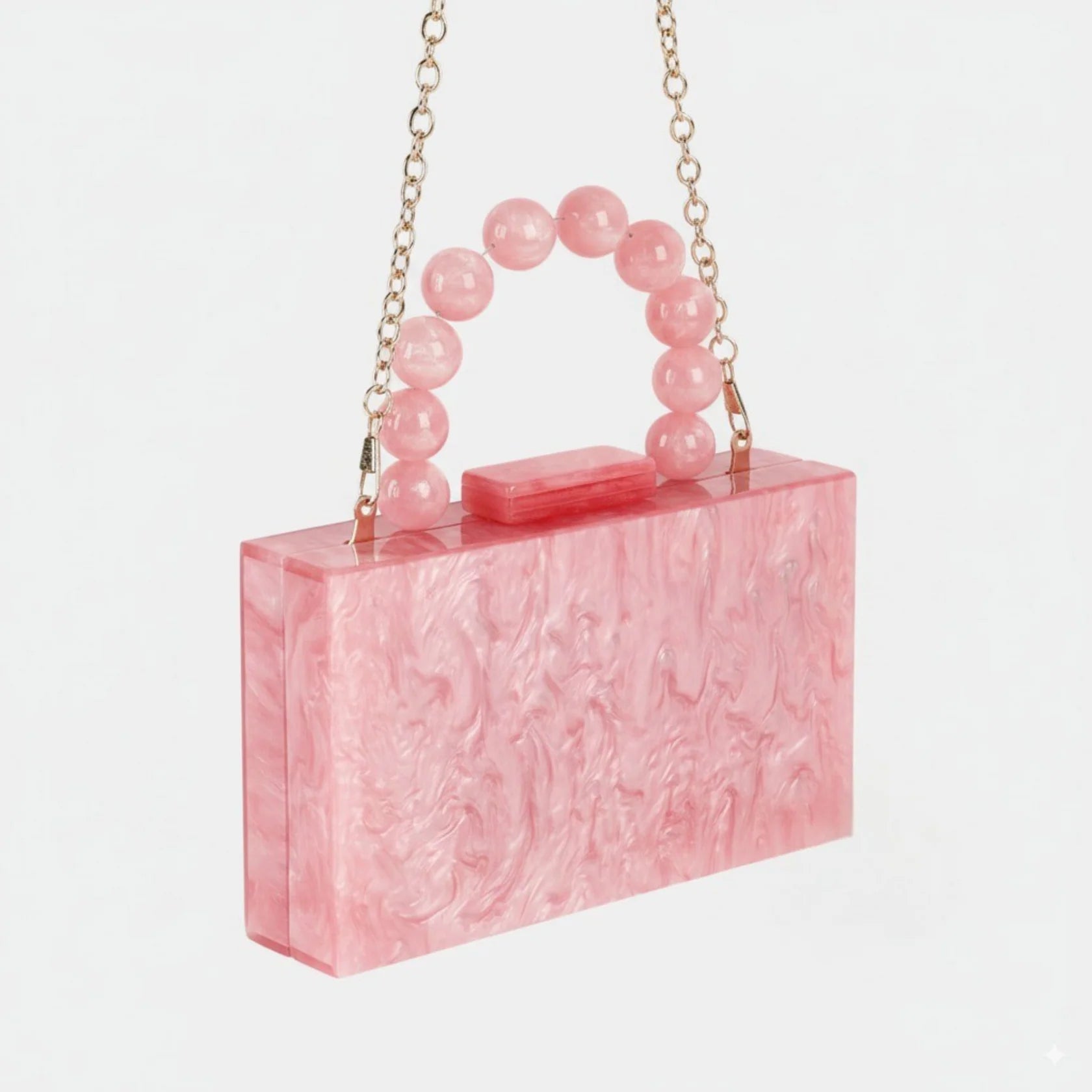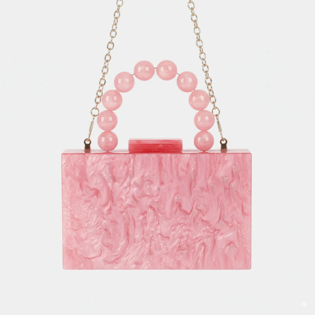Featuring a sleek marbled acrylic body and a rounded beaded handle, this bag blends playful charm with modern sophistication. Perfect for evenings out or as a standout accessory to elevate any look.