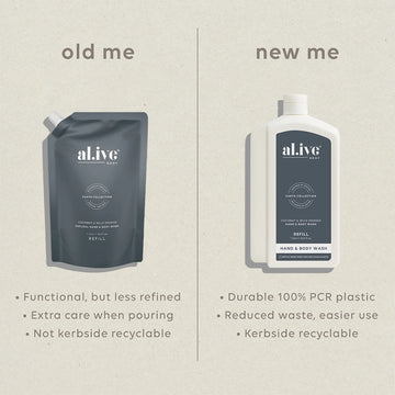 Our 1ltr refill pouches are designed to refill your existing al.ive body bottles whilst helping to reduce the amount of plastic used. Our refill pouches use 85% less plastic and refill your 500ml al.ive body bottle twice.