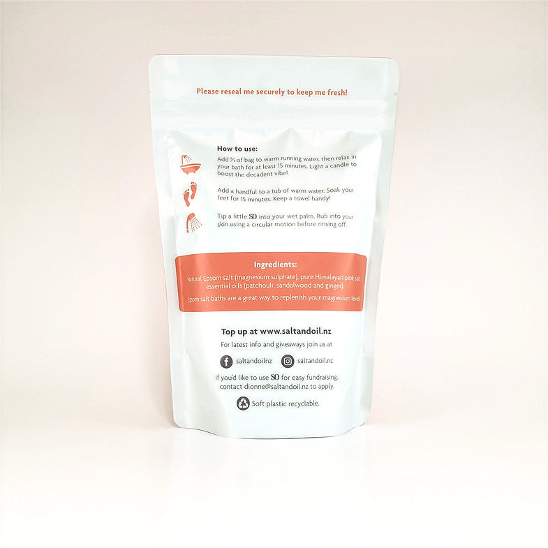 To our base of Natural Epsom salt and pure Himalayan pink salt we’ve added Patchouli, Sandalwood and Ginger essential oils.