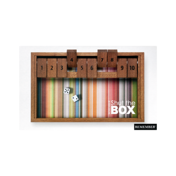 A quick dice game with simple rules: This game requires both luck and skill, as each player must try to close as many of the numbered flaps of the box as possible. Whoever can close all the flaps ("Shut the box") wins immediately. But it's not as easy as it looks. Great fun - for one person or the whole family.