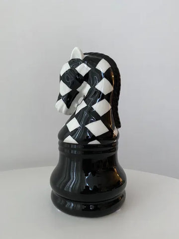 Discover the Capulet Ceramic Chess Knight, a playful twist on classic chess pieces crafted from sleek black and white ceramic.