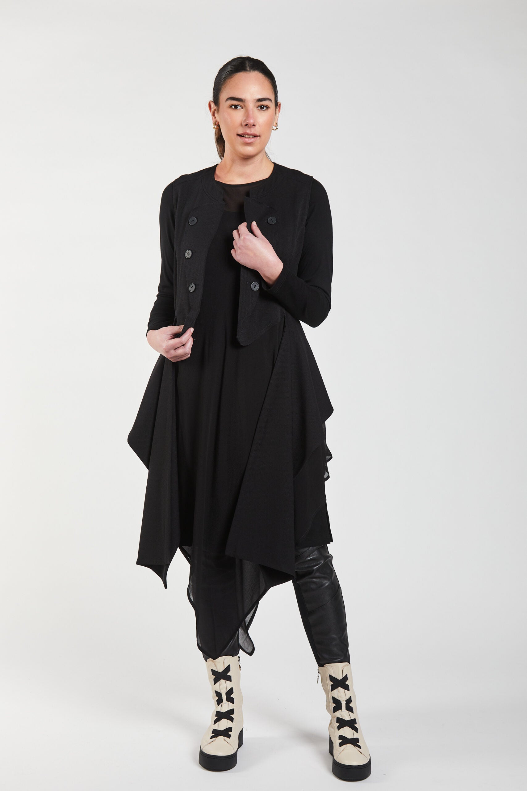 Buttons sit on a sharply defined front panel that reads almost like a structured lapel, lending the garment an authoritative, military inspired feel. Layered over a long-sleeve top, emphasising its role as a statement layer designed to enhance and reshape the silhouette beneath it.