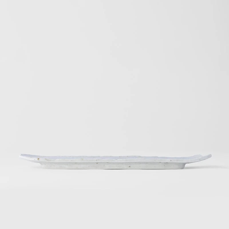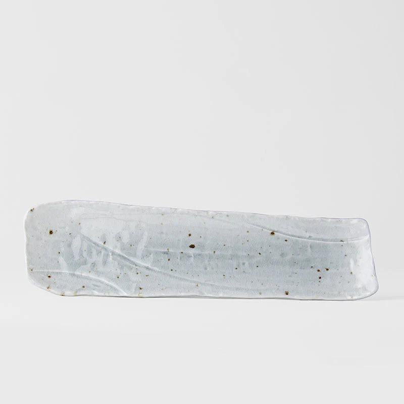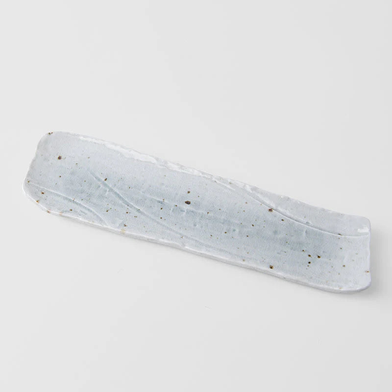 An organic shaped sashimi plate featuring a beautiful pale grey glaze. Made of 'Minoyaki' porcelain, fired at a high temperature and hand finished in Japan. Each piece has a unique pattern determined by its position in the kiln during the firing process.