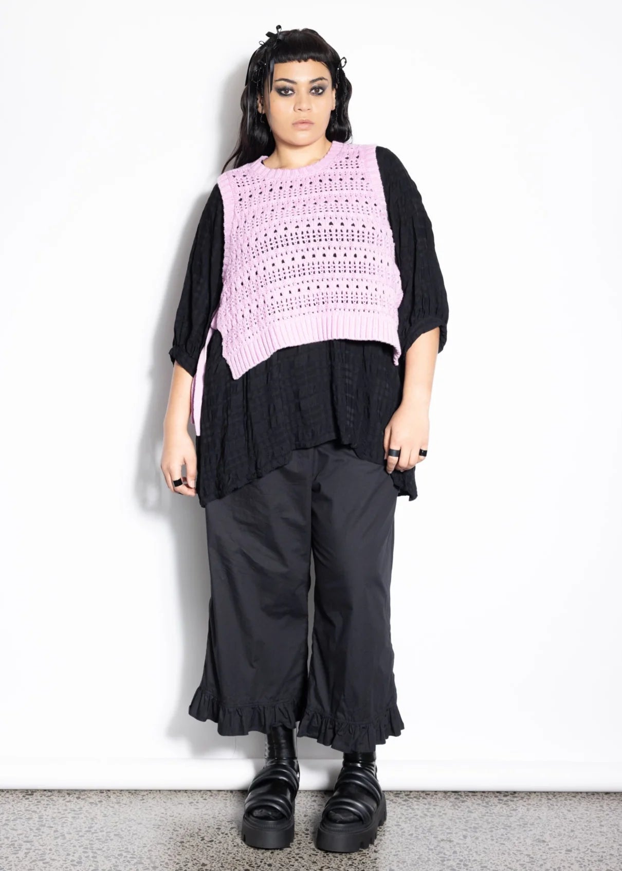 The new Lani Vest gives a cool crop silhouette to whatever you choose to layer it over or wear it on its own! The lacey knit design and cotton yarn make it ideal for summer. The side splits give you a nice line, and the side ties are adjustable to give you the perfect fit. You can style this so many ways, from business casual and preppy to streetwear and boho vibes.
