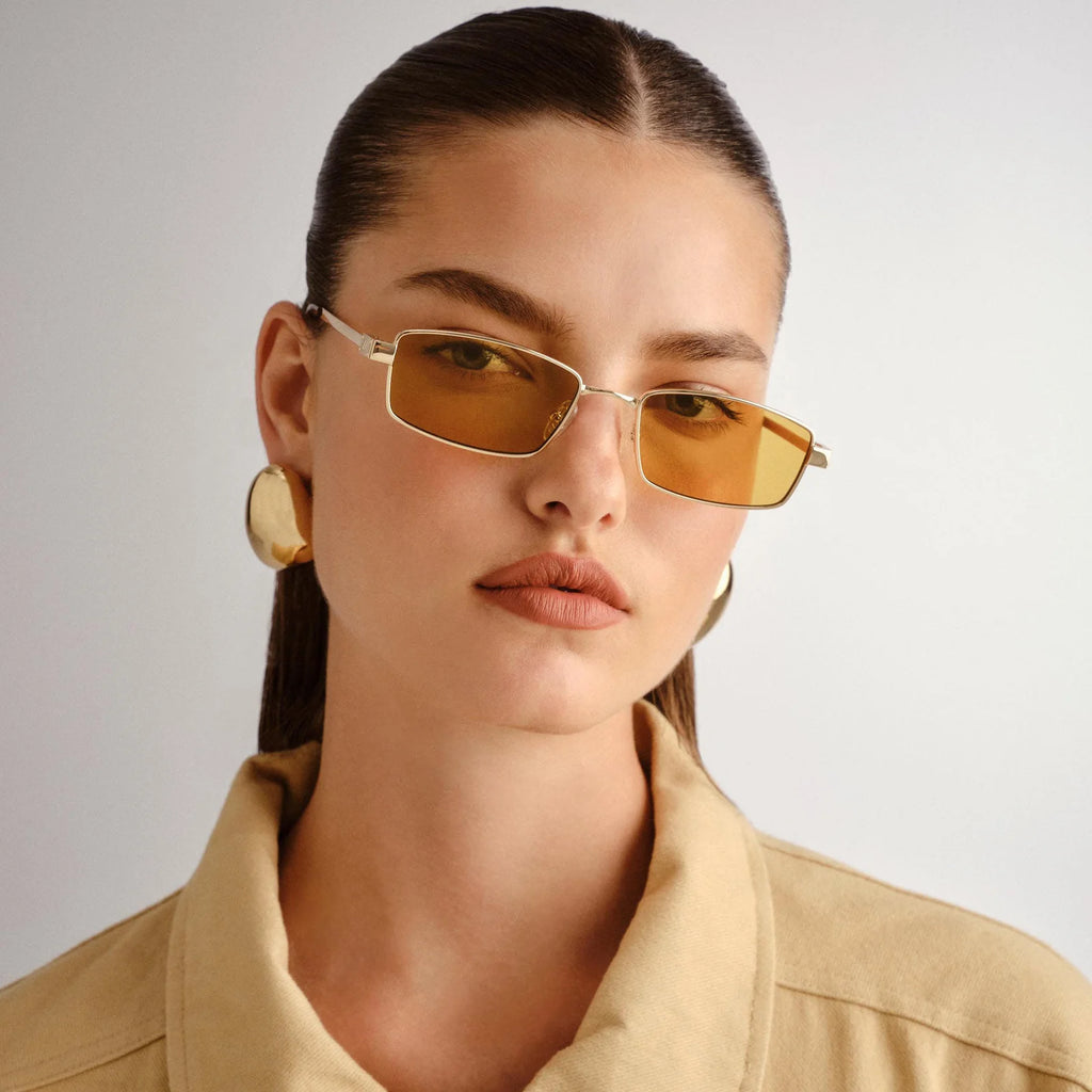 • Finished in a bright gold frame with ochre mono lenses.