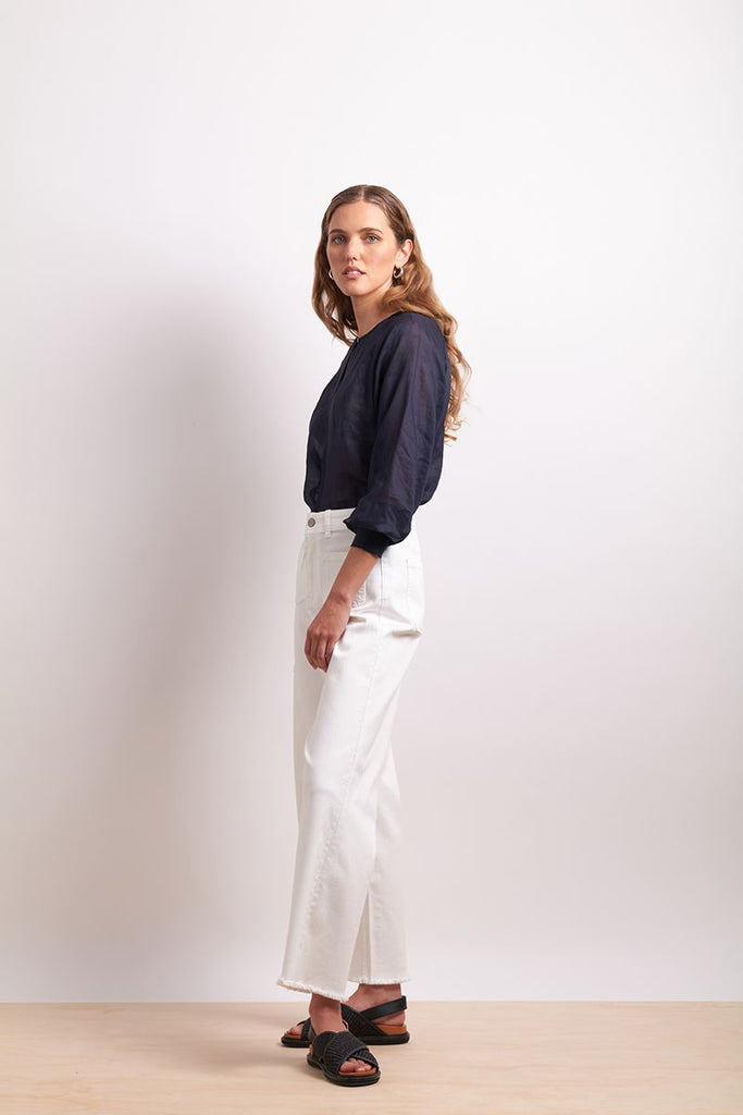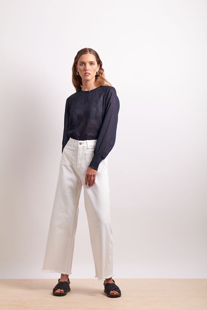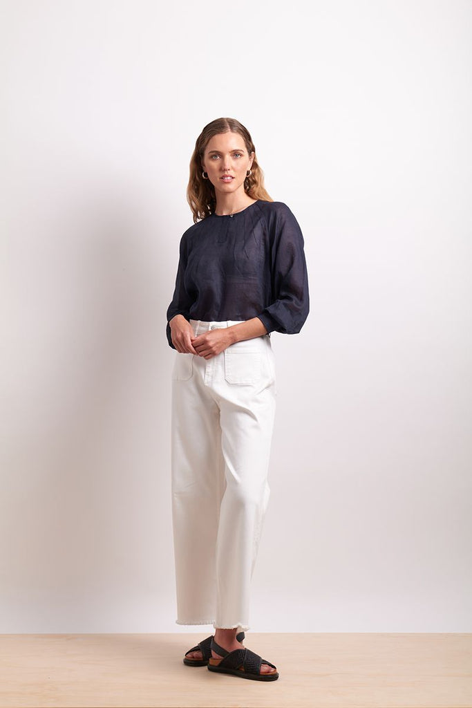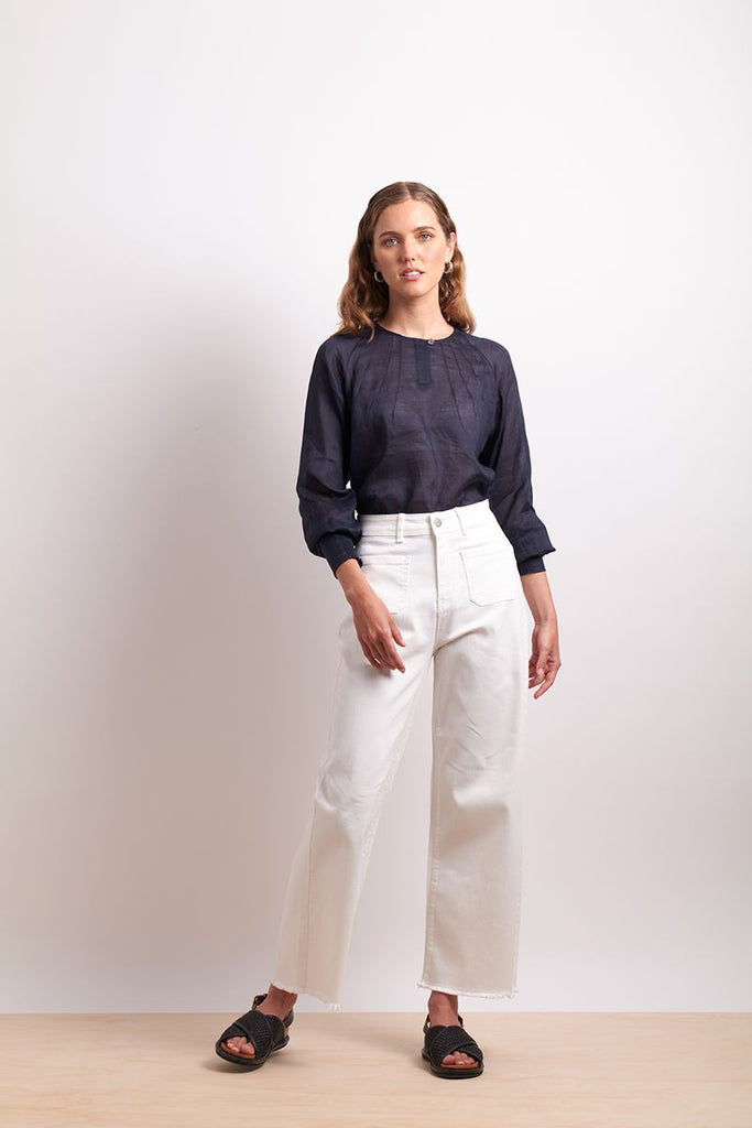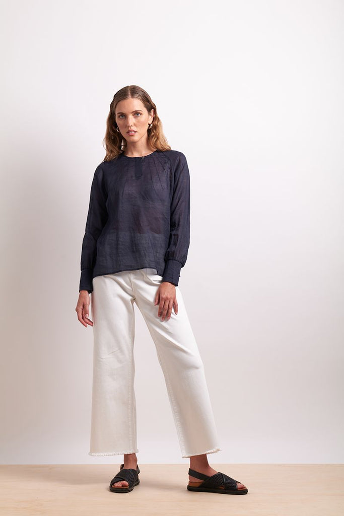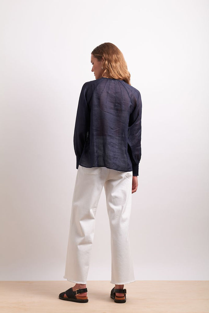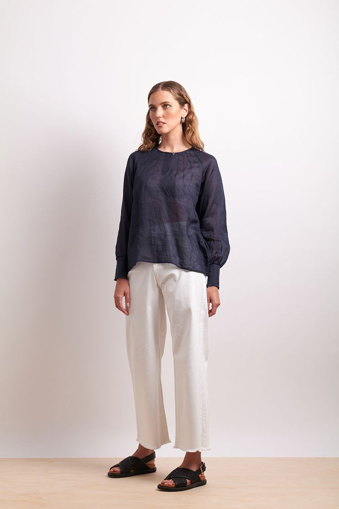 Featuring pintuck panel detailing on the loose three-quarter sleeves and a classic collar, it’s an elegant style made from 100% ramie that is airy and light, ideal for layering.