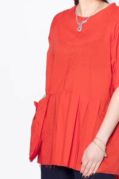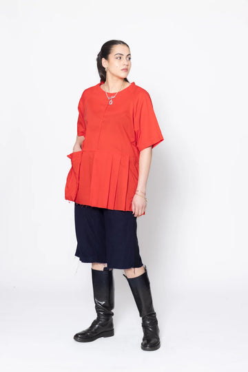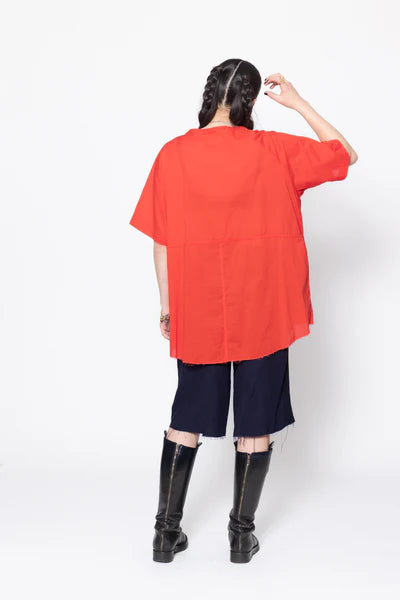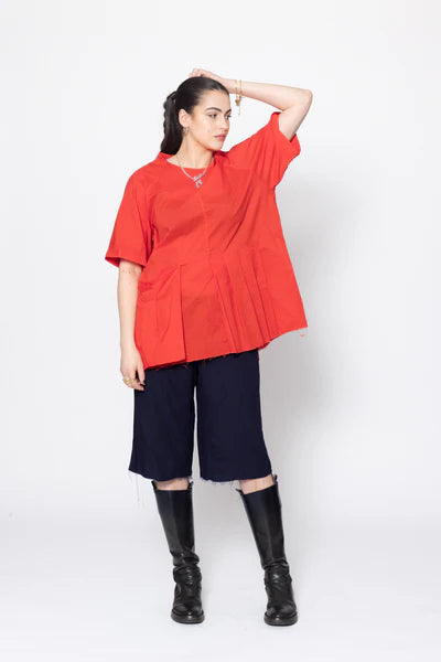 Short sleeve tee in a cotton shirting, designed for an oversized fit. Front features round bound neck, wide pleating on one side and a large pleat pocket on the other, roomy raglan sleeves and french seam details. This tee is pre-styled ready to go, worn with the Polar Shorts.