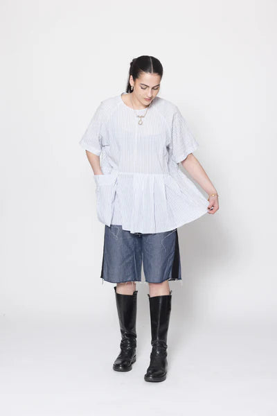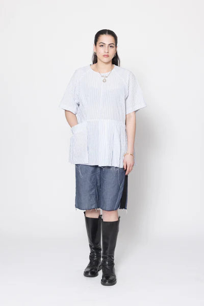 Short sleeve tee in a striped cotton shirting, designed for an oversized fit. Front features round bound neck, wide pleating on one side and a large pleat pocket on the other, roomy raglan sleeves and french seam details. This tee is pre-styled ready to go, worn with the Polar Shorts.