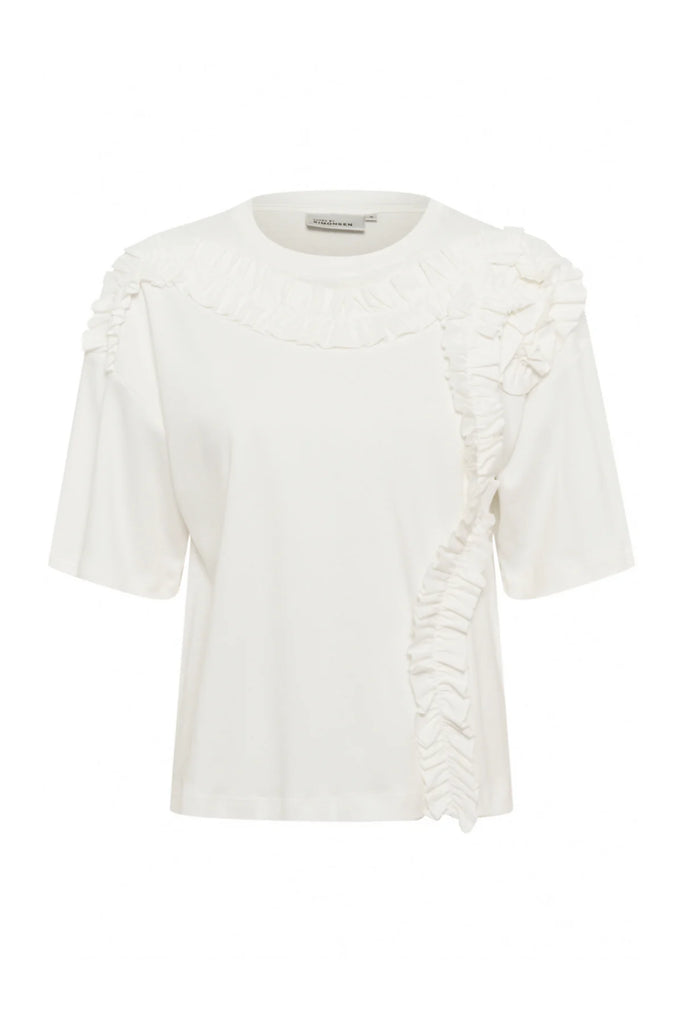 The Vivian Tee in Bright White by Karen by Simonsen gives the everyday cotton T-shirt a refined twist. Designed with a classic fit and hip-length cut, this elevated white tee features soft ruffle detailing that runs across the chest and shoulders for a feminine, textured finish.