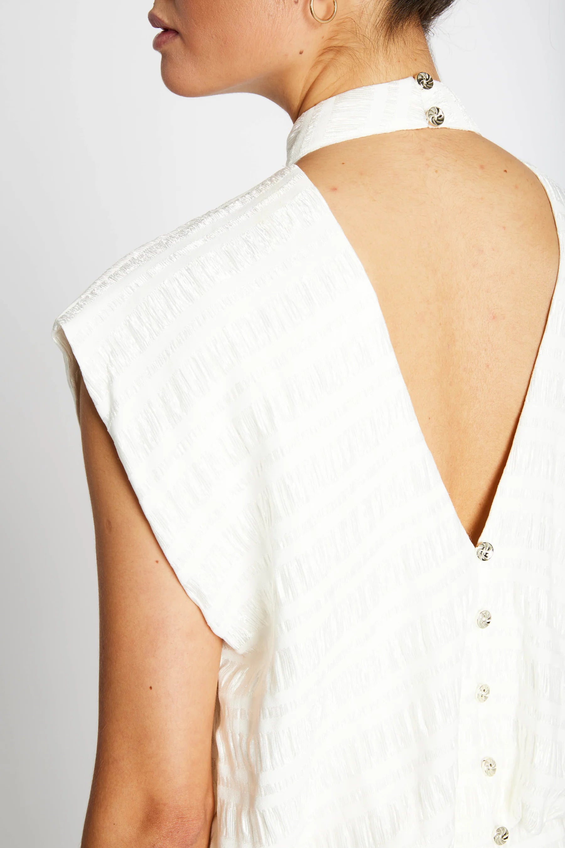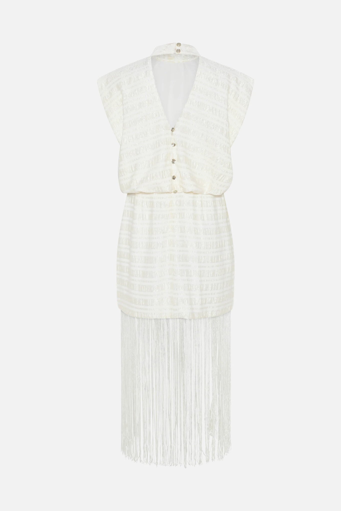 The Pentzia Malisa dress is a sophisticated dress with a regular fit and an elegant fringe detail. The bottom is designed like a regular skirt with a zipper, and the dress has buttons in a V-back and behind the neck. Lining provides extra comfort.
