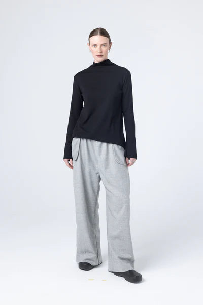 Long sleeve slim-relaxed tee in a black soft cotton rib knit. A high turtle neck style with slight flared sleeves, scooped back hem with raw neck and hems. A great high neck top to wear as is or layered up, worn with the Lust Pants.