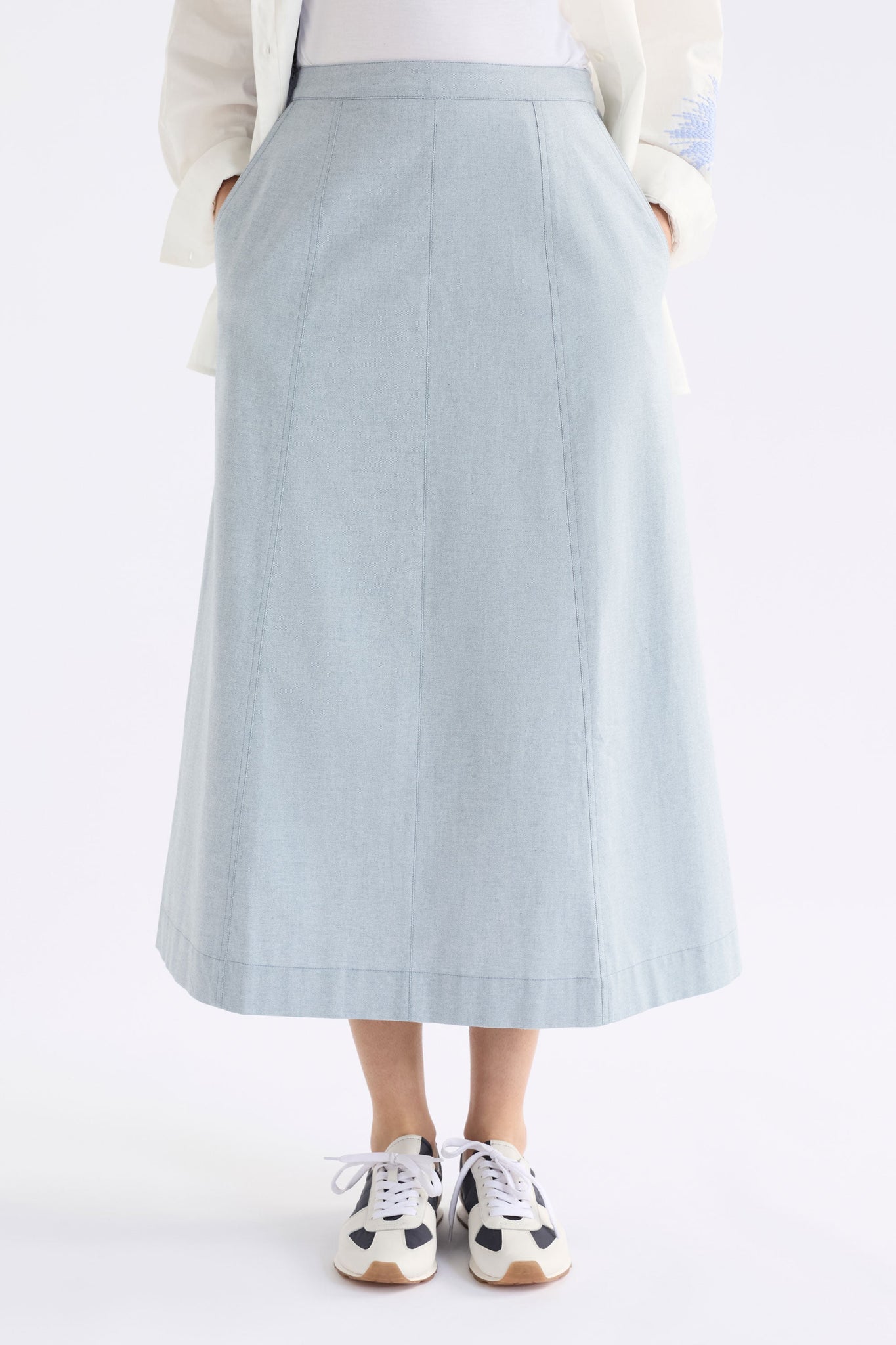 The Hanning Skirt is a midi-length A-line style crafted from a lightweight woven, organic cotton, with a light chambray twill appearance. This regular fit skirt features a panelled design, with elasticated back waist for comfort, angled side-seam pockets, and an invisible side-seam zip. The softly structured A-line design with clean lines creates a relaxed yet refined look. A versatile skirt that can be dressed up or down depending on the occasion, pair with the Hanning Jacket for a matching ensemble or with neat fitting tops or knits.