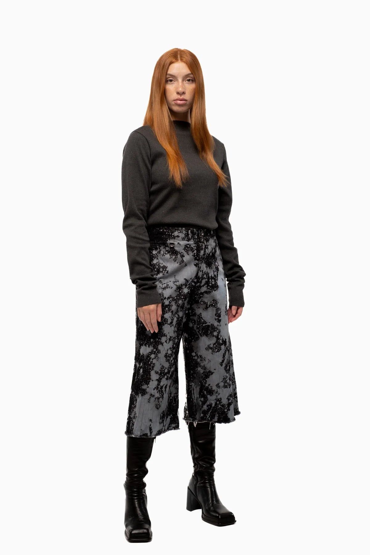Cut from deadstock Italian-origin denim, Ash Bleach is hand-bleached, washed, and pressed by Julia in the JPALM workroom. This colourway features finished side seams and a soft splatter bleach effect — each pair is completely unique.
