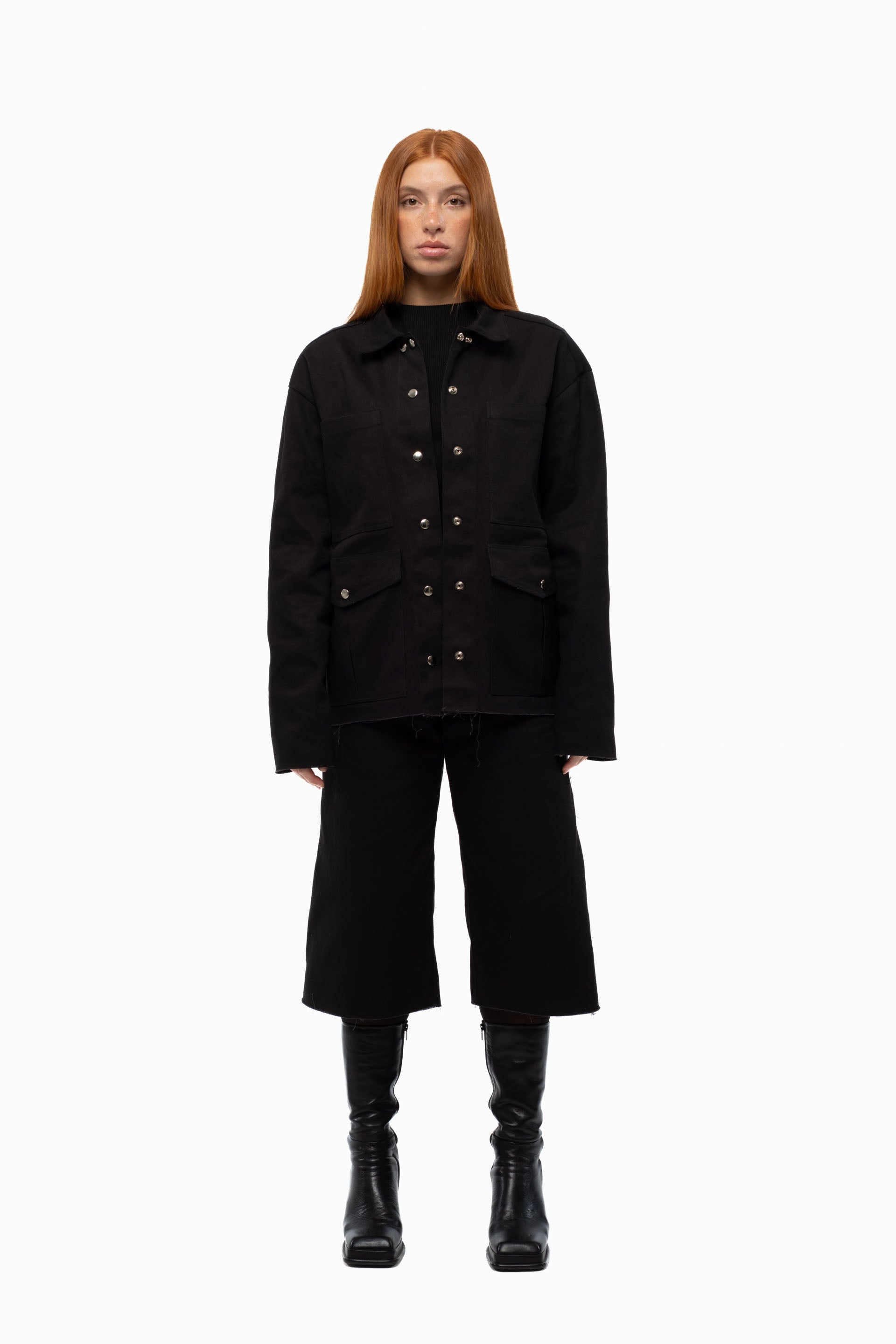 These black utility shorts are crafted from 100% heavy cotton denim, hitting right at or just below the knee.