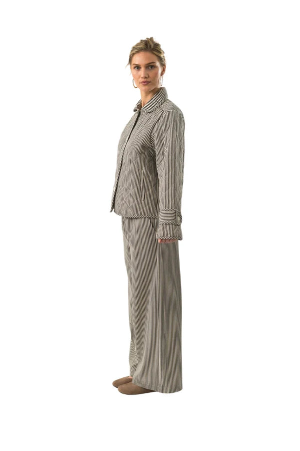 The Viola jacket feels both lightweight and exclusive. It is elegant and timeless, and in this version, it comes in black/cream stripes. With its classic cut and delicate details, it is a perfect choice for both everyday wear and more sophisticated looks.