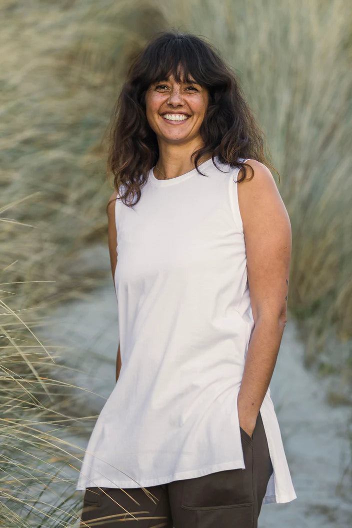 Featuring a relaxed sleeveless fit, crew neckline with slim self-fabric binding, and a long stepped hemline with side splits.