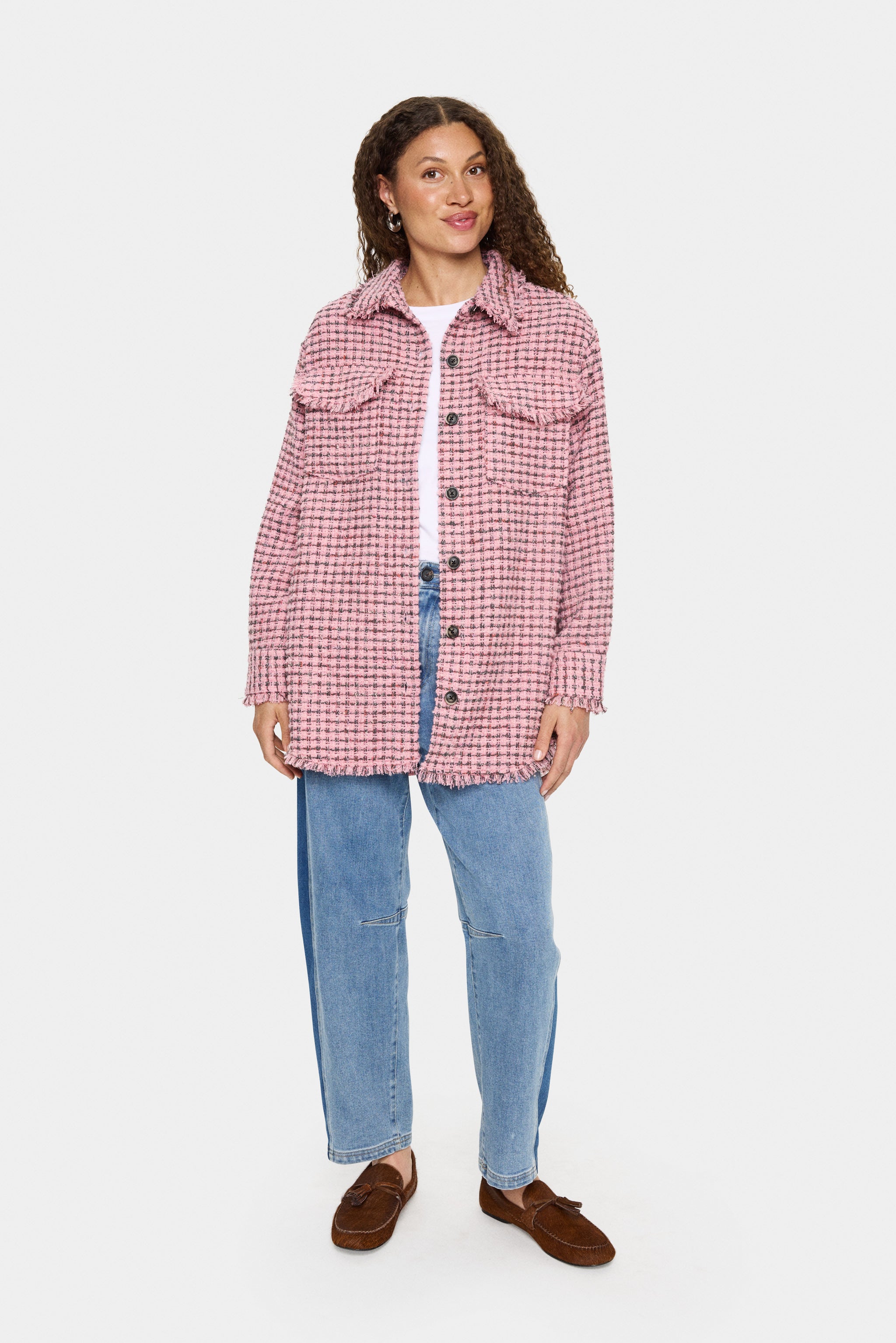 Soft pink tweed meets effortless cool in this charming shacket that's ready for anything. Layer it over your favourite tee, dress it up with tailored trousers, or wear it solo, this textured piece brings a playful edge to your autumn wardrobe.