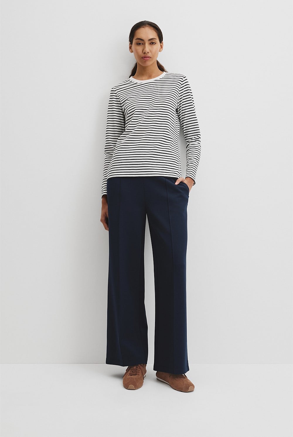 A classic long sleeve style designed with a regular fit. Finished with a crew neckline, solid coloured neckband and a fine stripe print, made using textured slub cotton jersey.