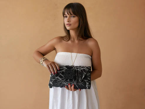 This stunning natural leather clutch is individually made and lovingly etched by hand to form a gorgeous floral pattern. Lined in eye-catching satin fabric using our logo design, the clutch is wonderfully tactile to hold. Finished with a love knot obsidian ingot and our signature tassel.