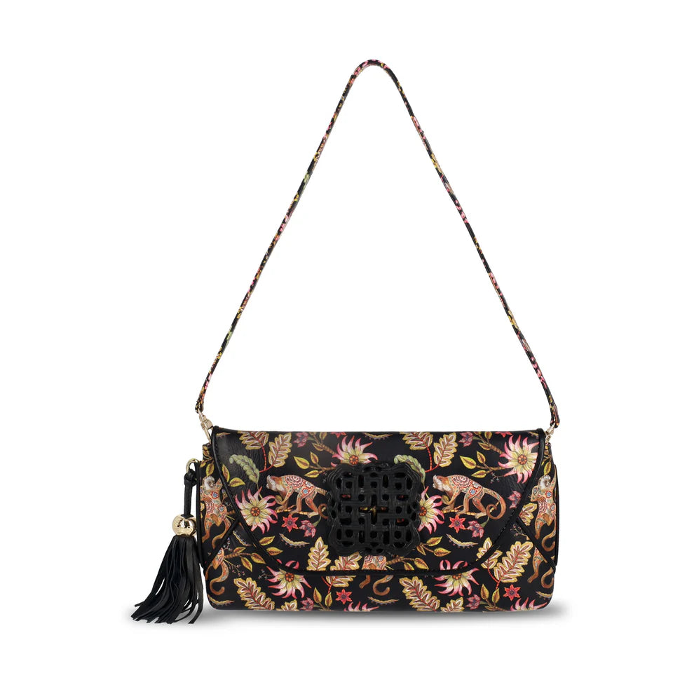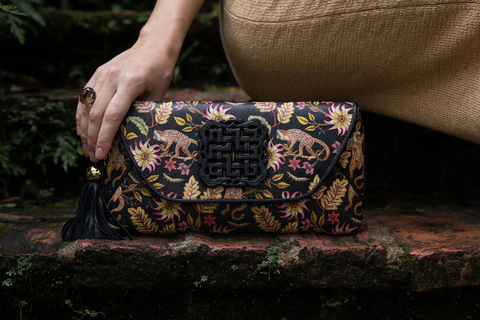 This gorgeous envelope is sumptuous to hold and is resplendent with a Love Knot Obsidian stone ingot. The interior lining features our eye-catching logo mark, and the bag is finished with our signature tassel.
