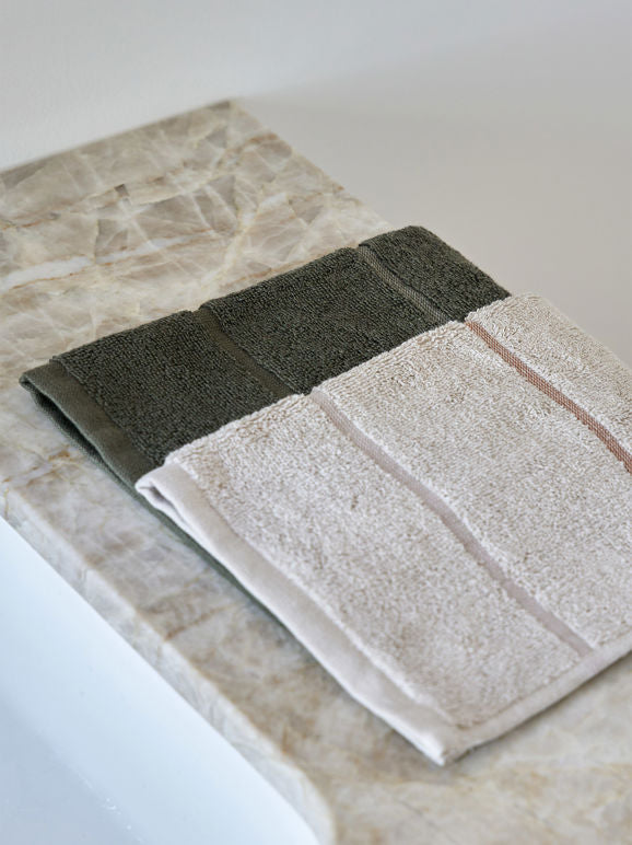 The Pia bath towel range adds a hint of soft colour to your bathroom. The subtly coloured flatweave stripe sits smooth while the body of the cloth has an absorbent terry finish.