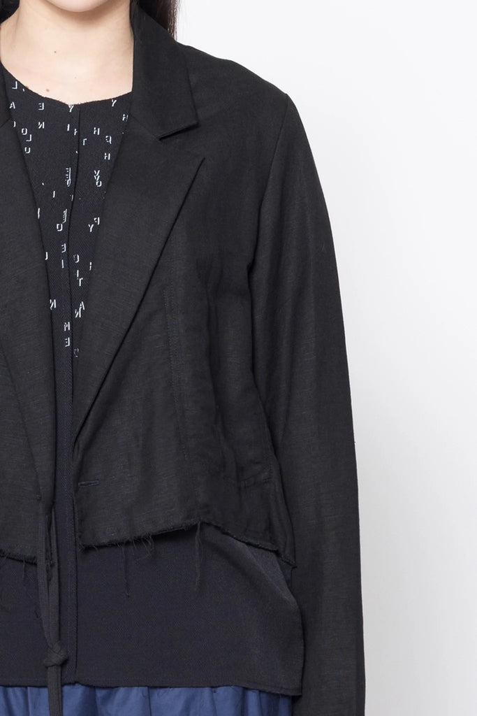Long sleeve jacket in a linen viscose suiting, designed for a relaxed to oversized fit. A tailored modestly cropped jacket with set in sleeve, collar and lapel, doubled back, buttonholes with tie and an internal patch pocket. This is a great versatile jacket, worn with the Stark Dress and Entitled Tee with Reality Skirt.