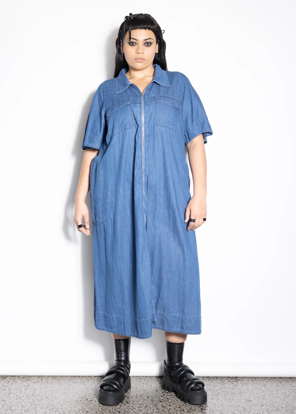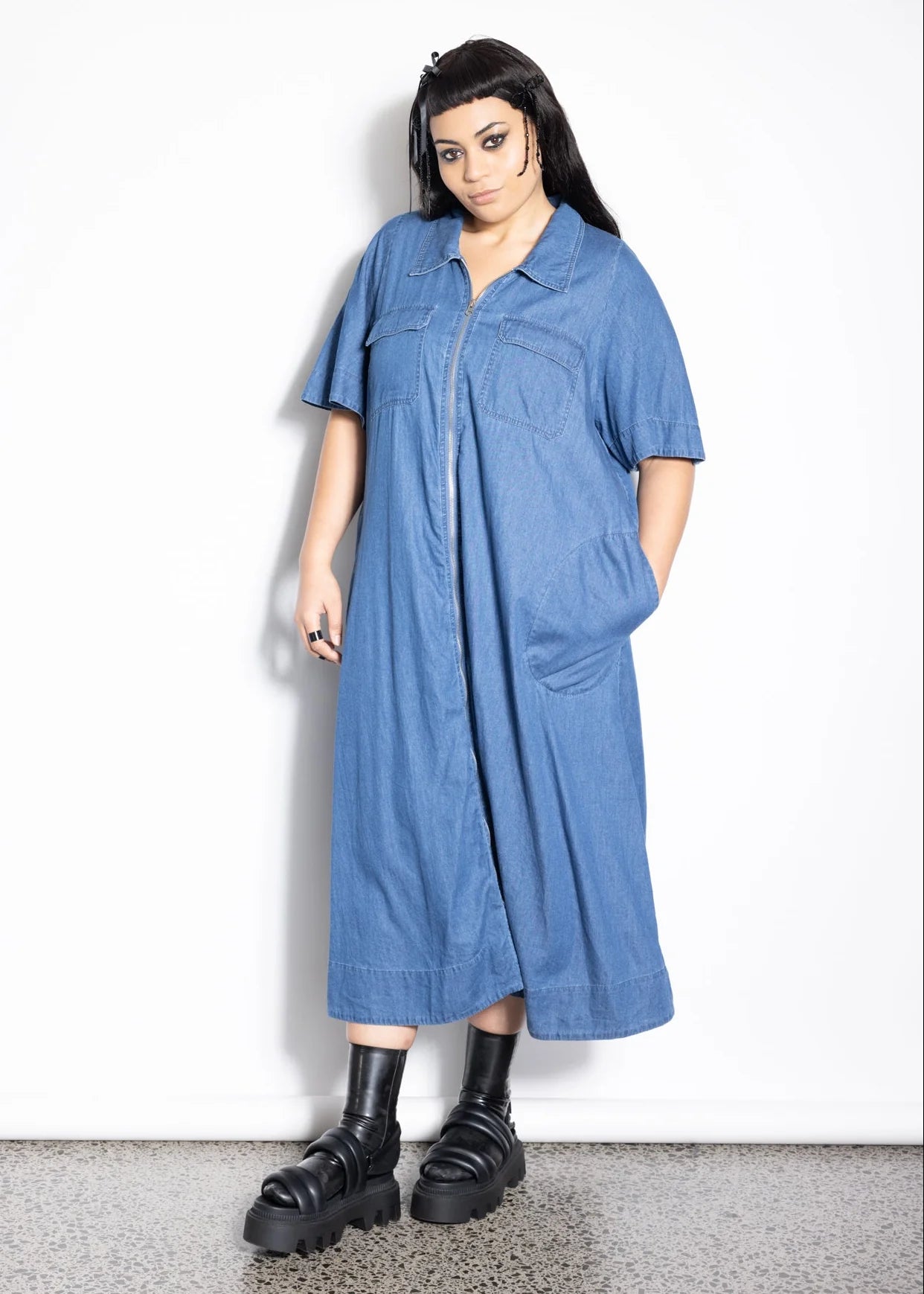The Chore Dress riffs on classic workwear like chore jackets and overalls with a polished finish. The Dress has a classic collar with a chunky open ended metal zip right through to the hem which allows you to wear it open as a light coat as well as a dress. We have added chest pockets and side seam pockets too. The dress shape is a flared from the bust with a flared sleeve which finishes at your elbow.