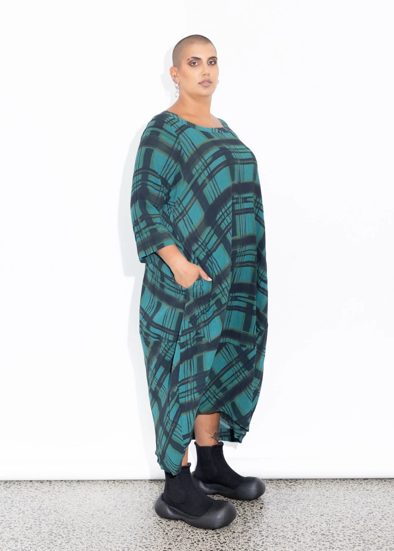 The Elsey Dress is back for winter with a longer sleeve and in our new LaLA print. The crinkle cotton fabric gives it plenty of drape and natural movement. This is a one-and-done type dress with no need to layer. We have played with the check direction on the rounded hem detail.