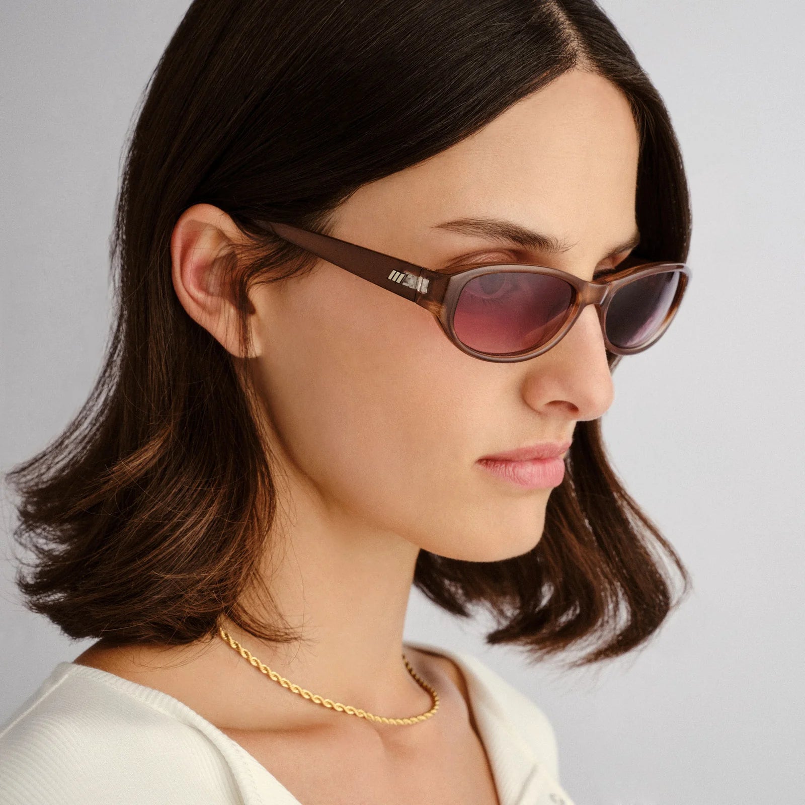 • Finished in a pearl chocolate frame with warm smoke gradient lenses.