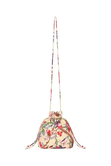 Introducing the LotusLL bag, a charming blend of bohemian elegance and vibrant style. This feminine pouch-style bag features a delicate floral print against a soft cream background, making it a versatile accessory for both everyday outings and special occasions.