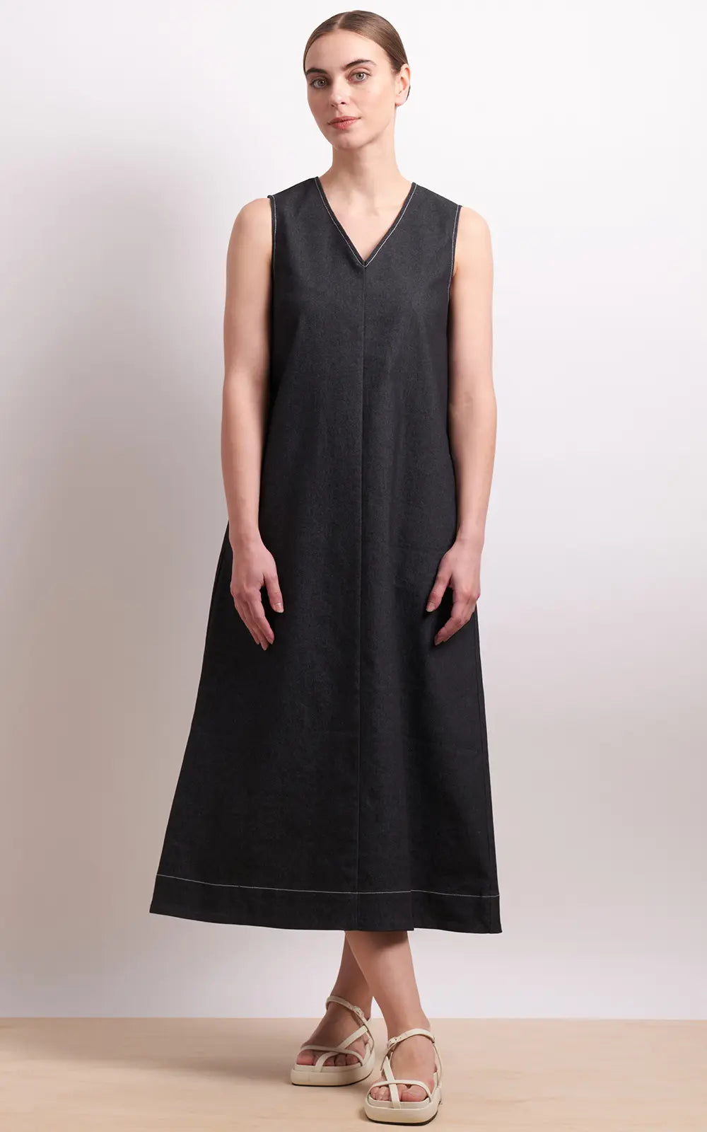 Elevated everyday style. The Buckle Up Dress in Ivory from Neris is a relaxed yet refined sleeveless midi with a flattering A-line shape that’s easy to wear and endlessly versatile. Crafted from lightweight stretch denim, it features a V-neckline, front side pockets, and the signature adjustable buckle detail at the back – adding both function and a modern edge.