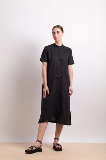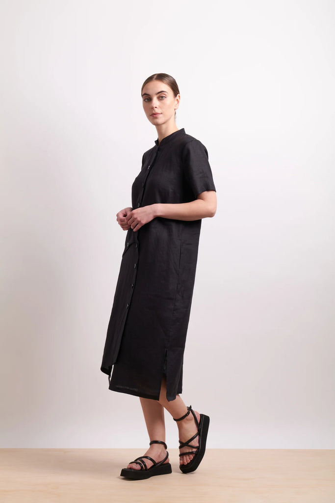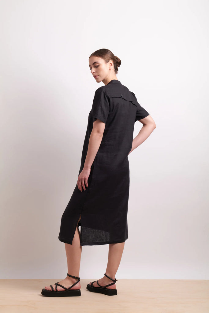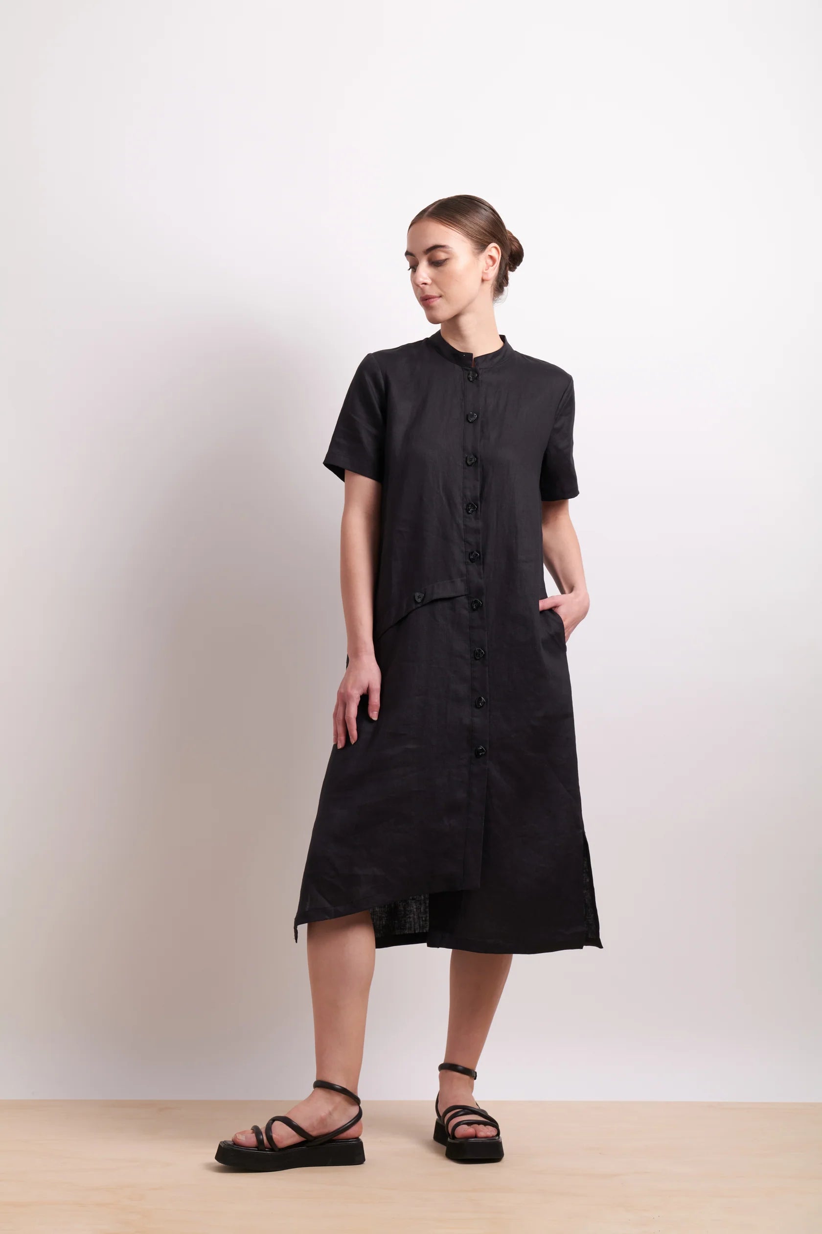 Tailored to flatter from every angle. The Divine Angles Dress is a 100% linen midi dress designed with sculptural panelling, side splits, and tonal button detailing.