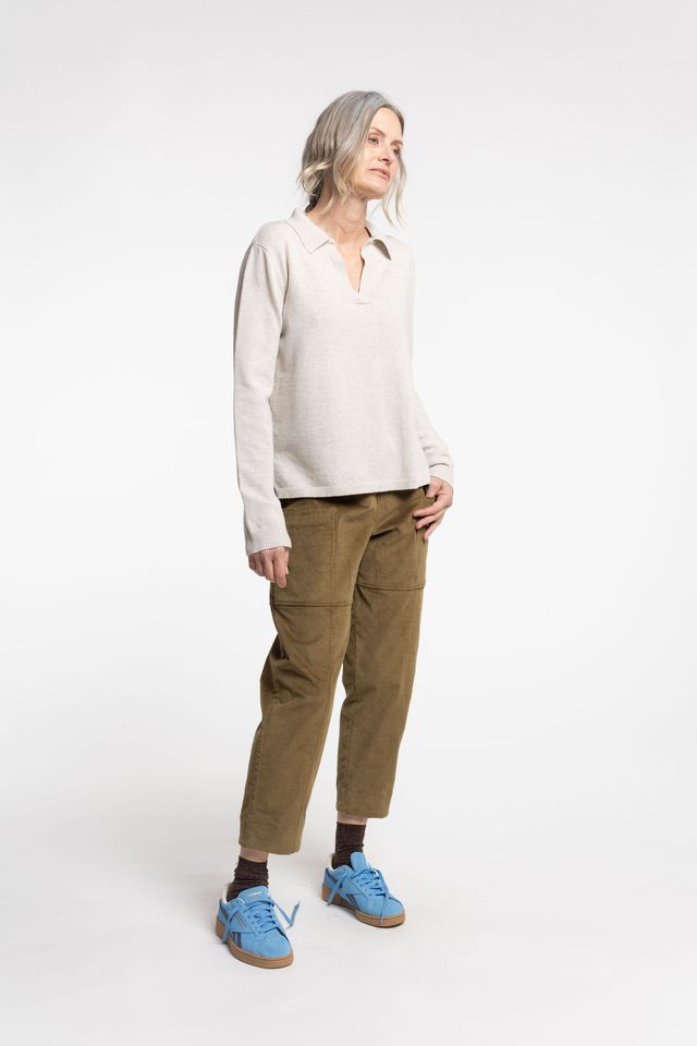 V-neck collared sweater crafted with long sleeves and finished cuffs, designed by local designer Natalie Newlands.